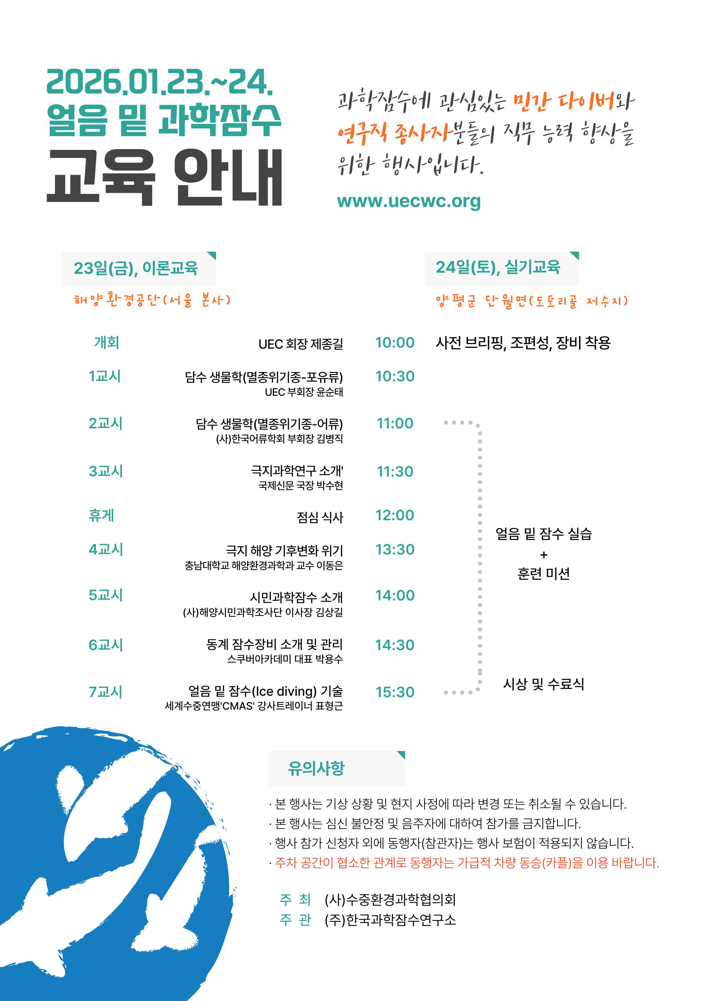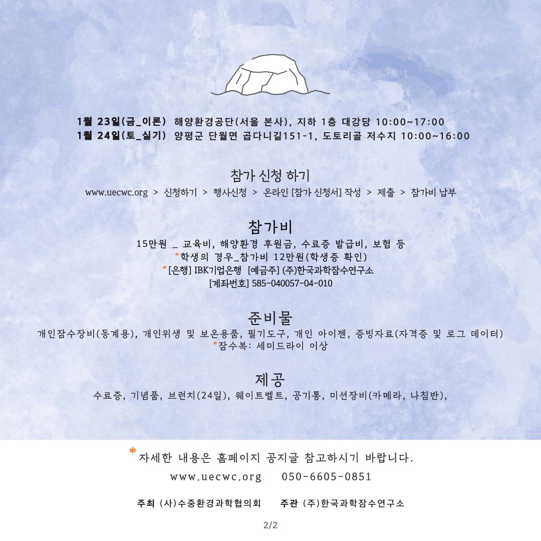 이에 겨울 시즌 수중 연구 활동 활성화를 위하여 국내 최고의 동계 잠수 전문가 그룹과 동계 과학잠수 교육 행사를 개최합니다.