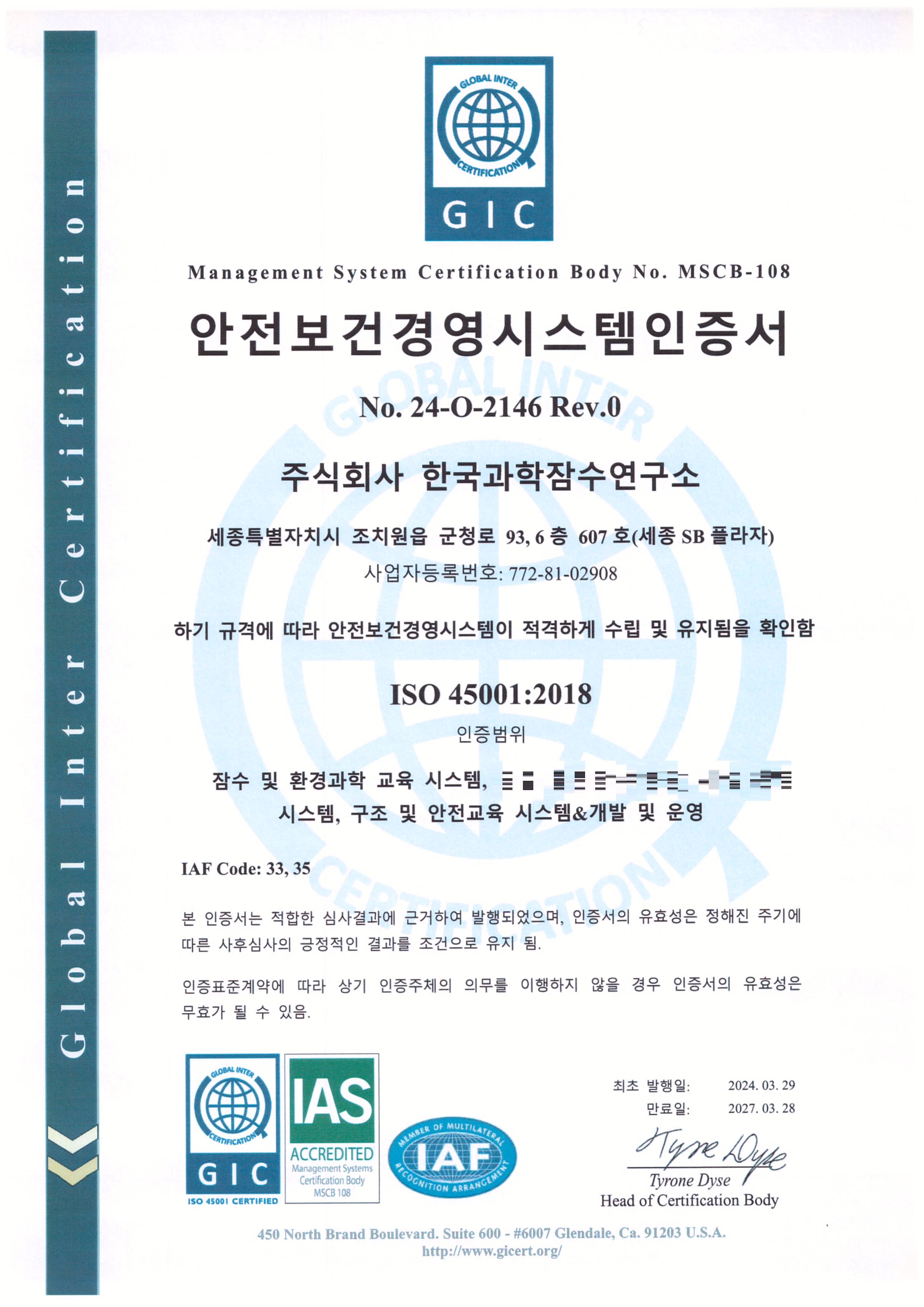 (주)한국과학잠수연구소는 과학잠수 교육에 필요한 국제 표준 요구 사항을 충족하여 2024년 3월 29일 '국제표준화기구 ISO 45001 안전보건경영시스템' 인증서를 취득하였습니다.